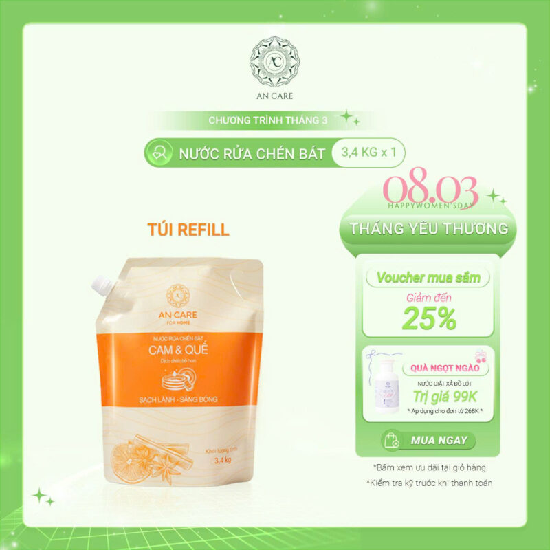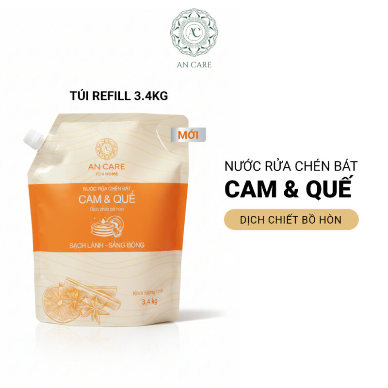 Tên sản phẩm: Nước rửa chén bát Cam & Quế AN CARE, DỊCH CHIẾT BỒ HÒN, SẠCH LÀNH SÁNG BÓNG Túi 3.4KG